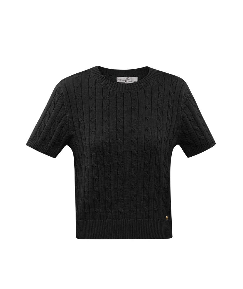 This knitted sweater with cables and short sleeves has a classic look and is very suitable for a business chic look. The sweater is made of polyester and available in black, light blue and white.